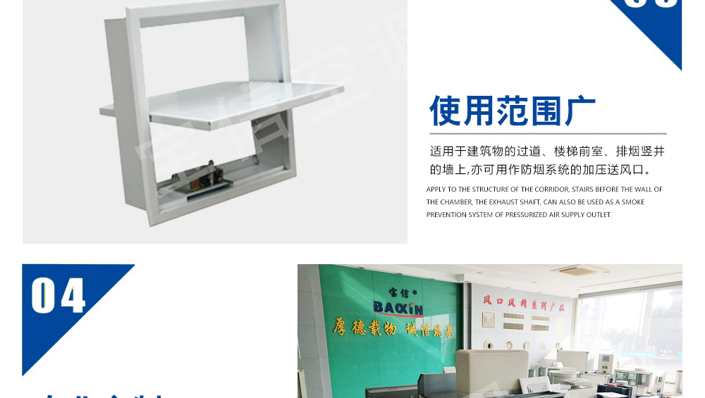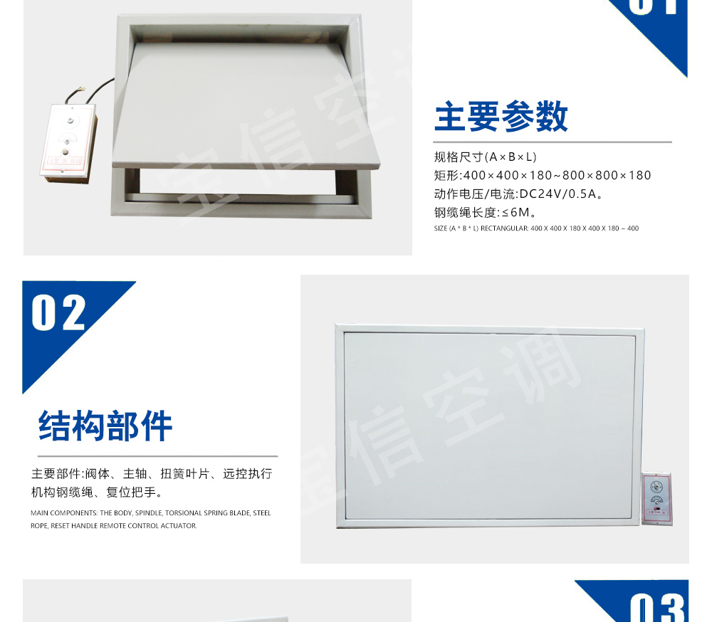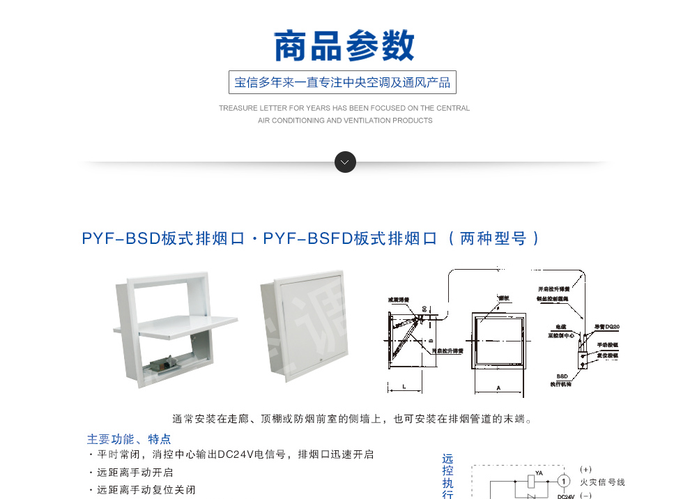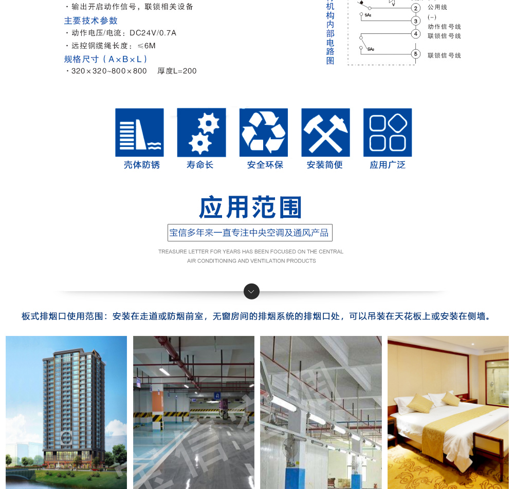 平時常閉,消控中心輸出DC24V電信號,排煙口迅速開啟