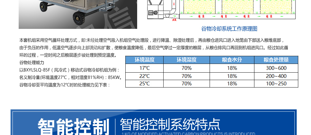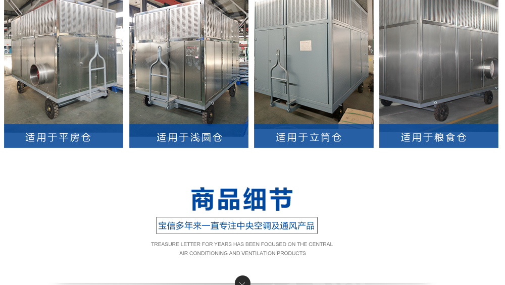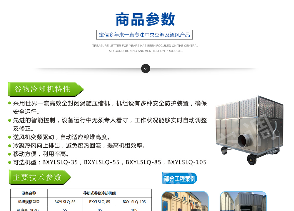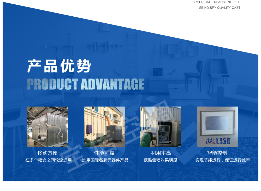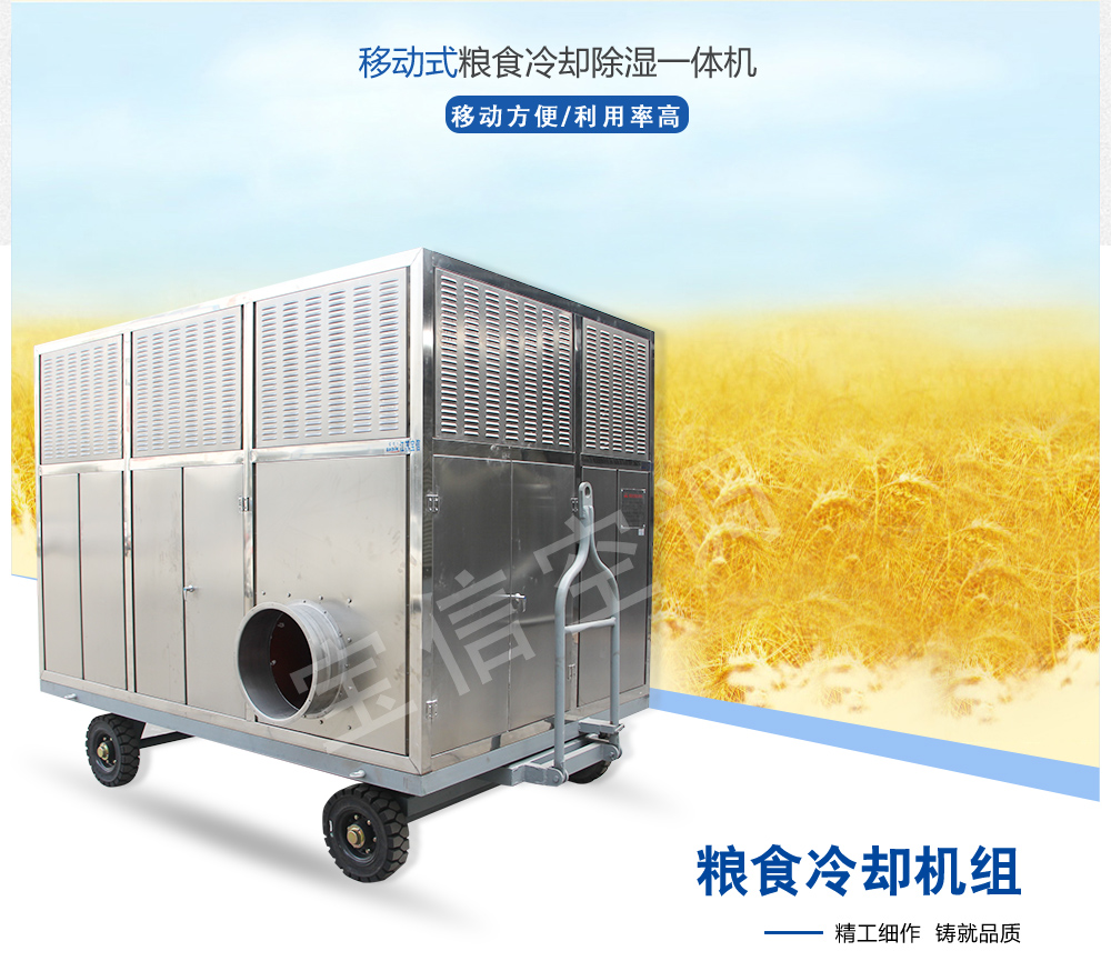 ?移動式糧食冷卻機組主要由風(水)冷壓縮機制冷除濕系統,空氣循環系統,智能控制系統和移動式基座組成。該空凋設備是專門針對我國糧食倉儲環境特點和氣候特征綜合分析而特別設計的移動設備,是各糧食儲備庫實現綠色儲糧、科學保糧目標的重要保障手段,其性能達到國內先進水平。該產品適用于:應急處理發熱糧食、安全保存高水分糧食、優質稻谷的低溫儲存等,可用于平房倉、淺圓倉、立筒倉的糧食冷卻除濕作業。
