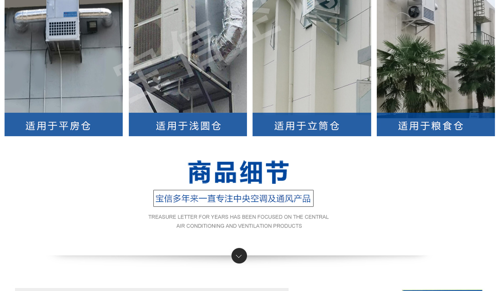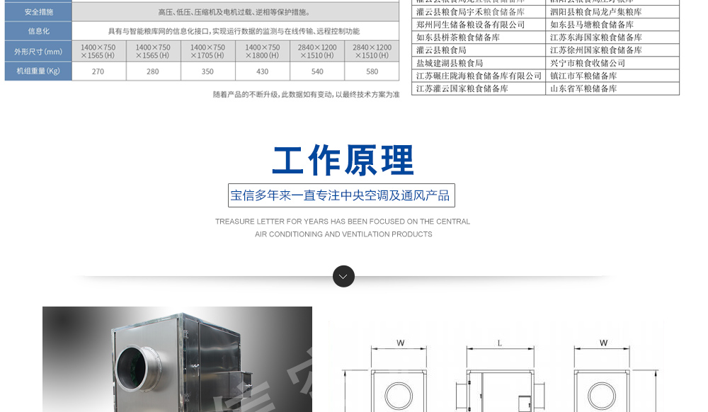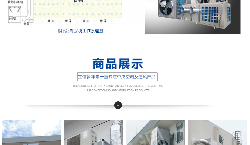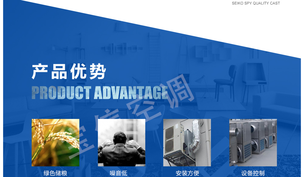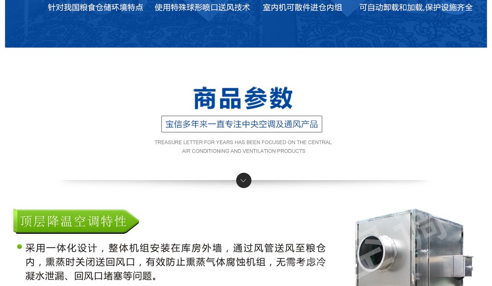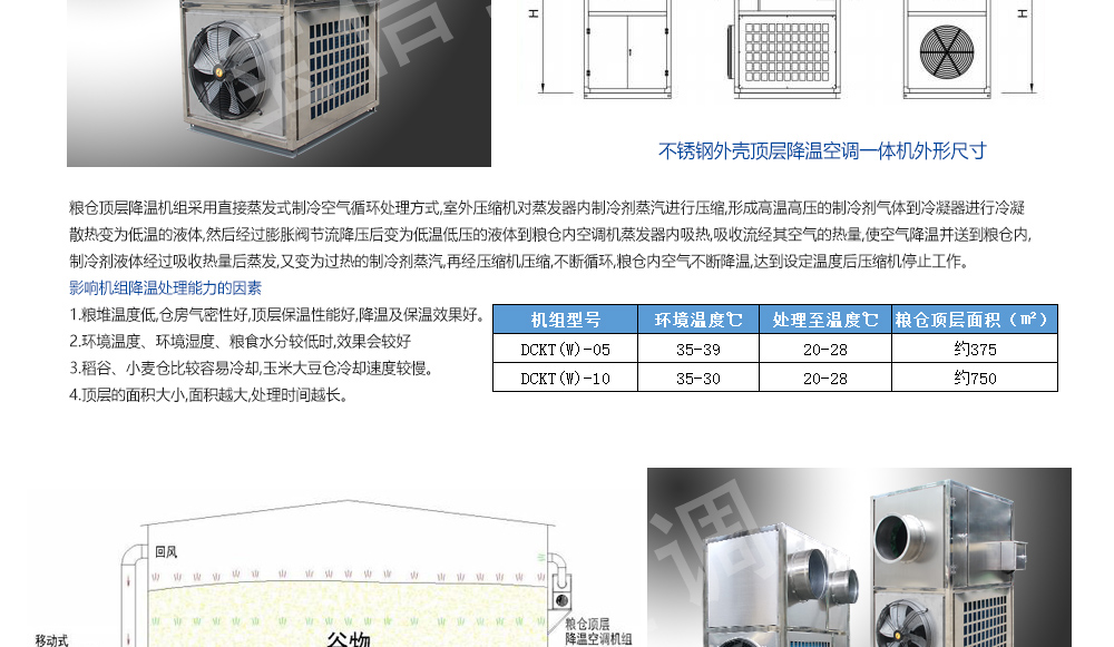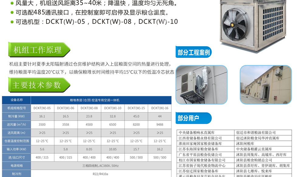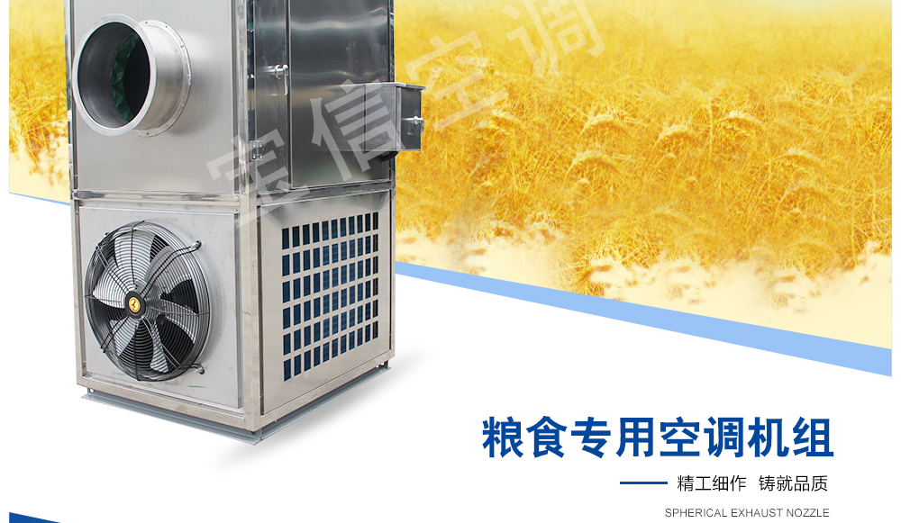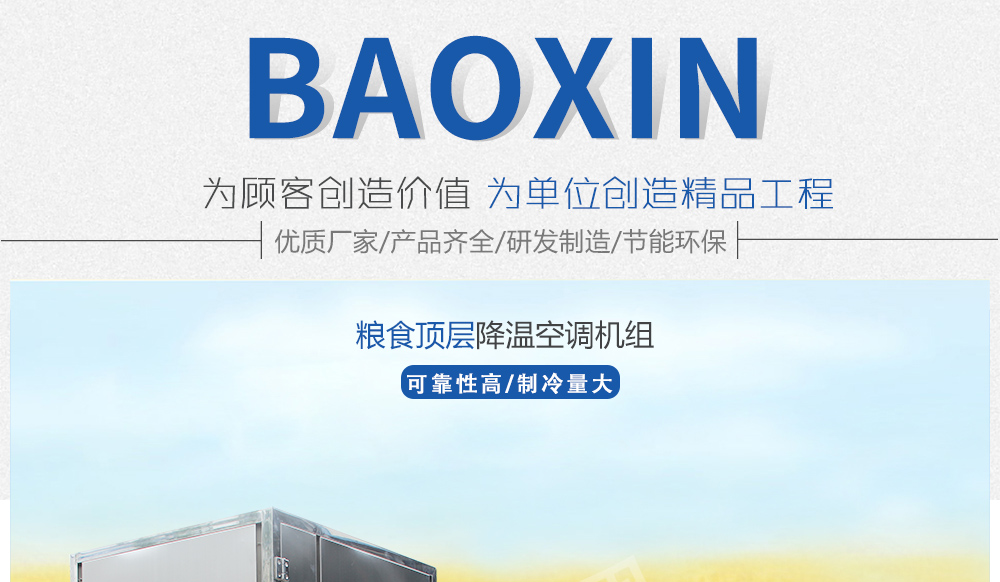 糧倉頂層降溫空調機組主要由風冷制冷降溫系統、空氣循環系統、智能控制系統組成,主要是針對我國糧食倉儲環境特點和氣候特征綜合分析而特別設計的糧倉頂層降溫系統,是各糧食儲備庫實現綠色儲糧、科學保糧目標的重要保障手段,其性能達到國內先進水平。