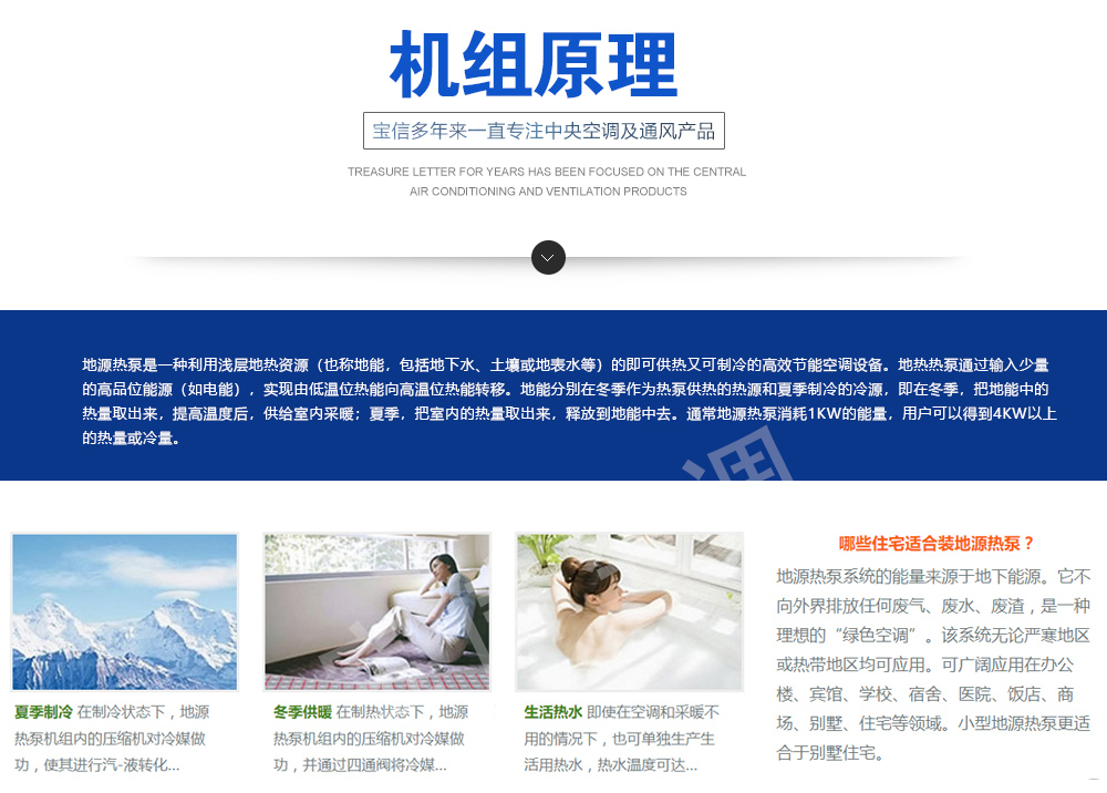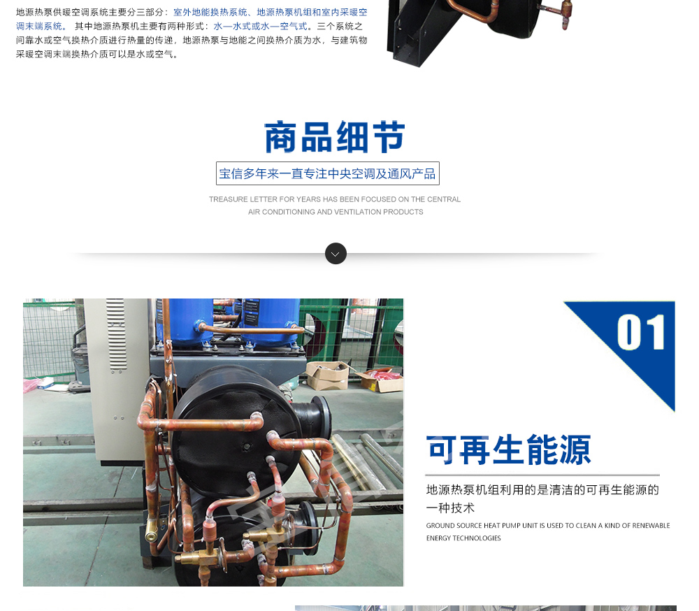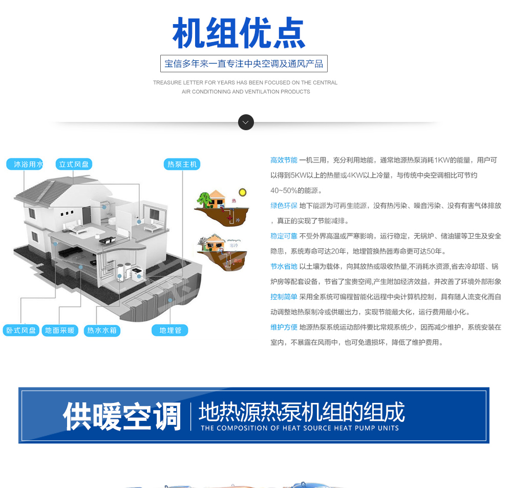 水/地源熱泵中央空調式我公司吸取世界各國地源熱泵產品精華,自主開發(fā)的新型供暖設備.該機組既保持與國外先進技術同步,又適應中國國情,是一種集制冷、供暖、供生活熱水為一體的高效節(jié)能的綠色環(huán)保中央空調。
