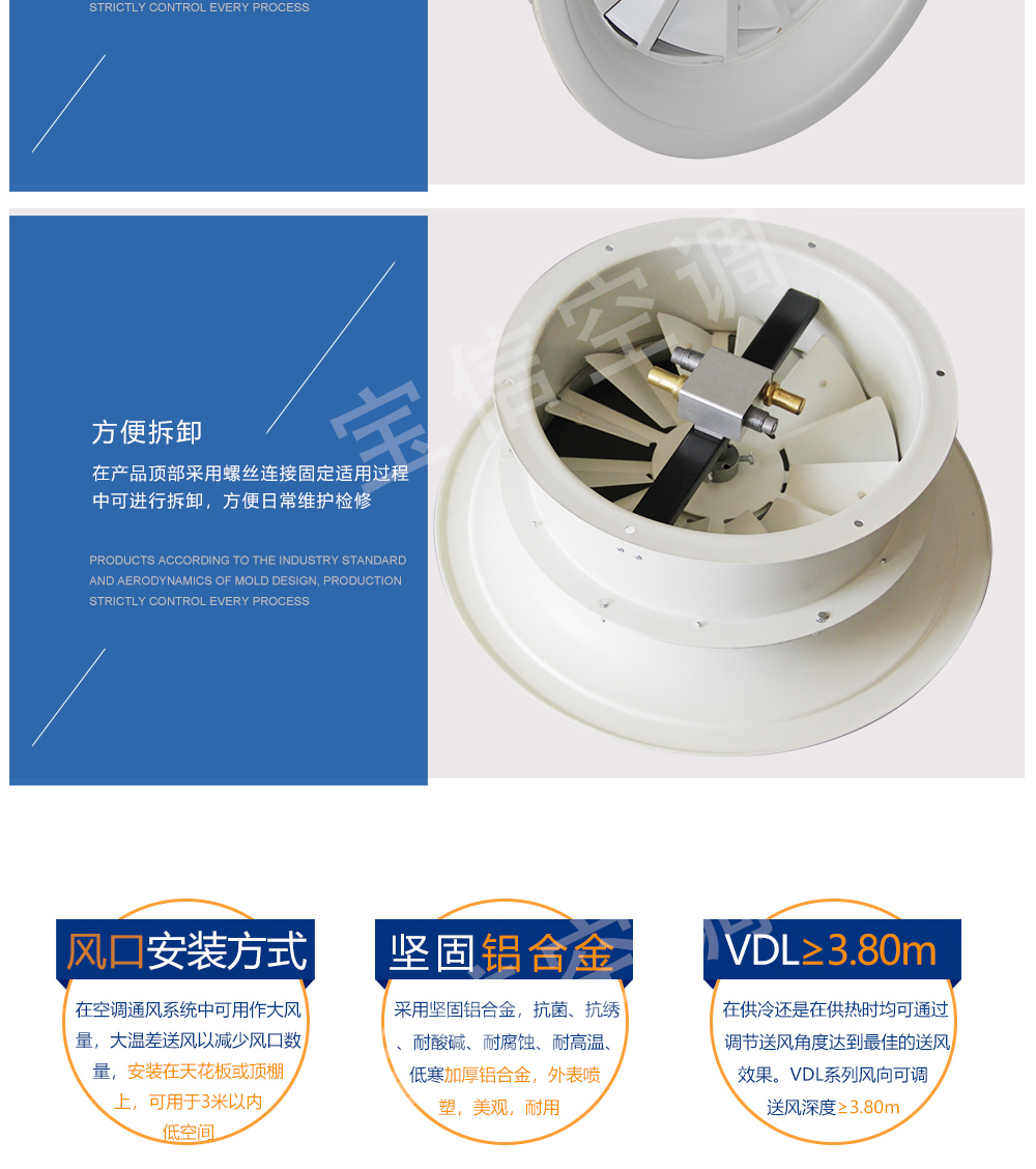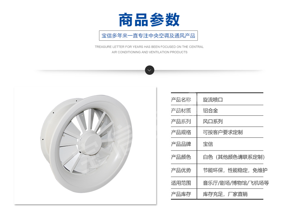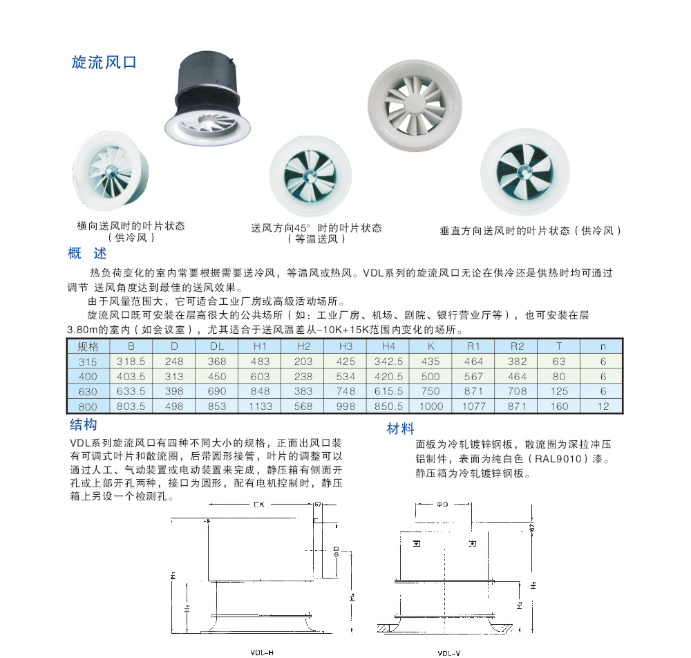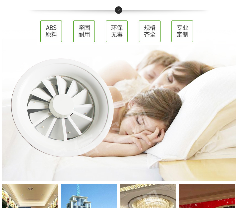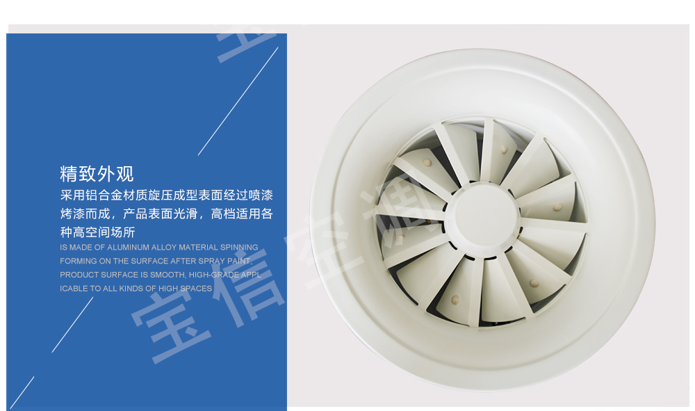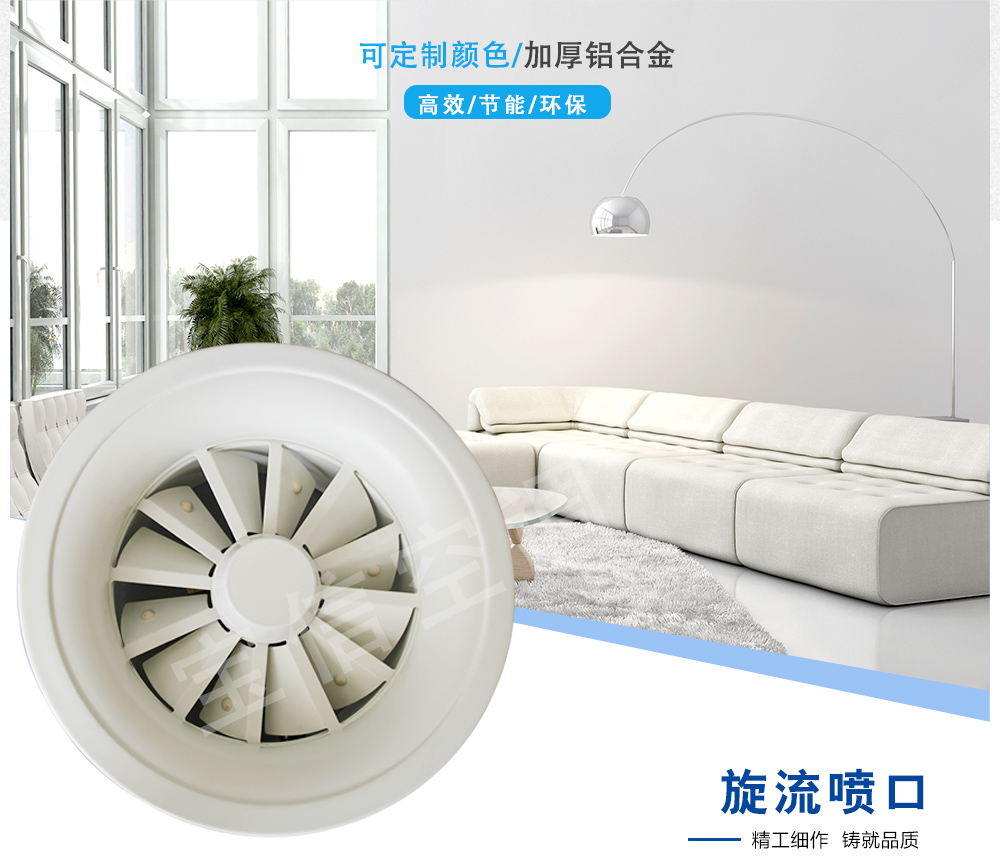 旋流風(fēng)口既可安裝在層高很到的公共場(chǎng)所(如:工業(yè)廠房、機(jī)場(chǎng)、劇院、銀行營(yíng)業(yè)廳等),也可安裝在層3.8m的室內(nèi)(如會(huì)議室),尤其適合于送風(fēng)溫差從-10K+15K范圍內(nèi)變化的場(chǎng)所。